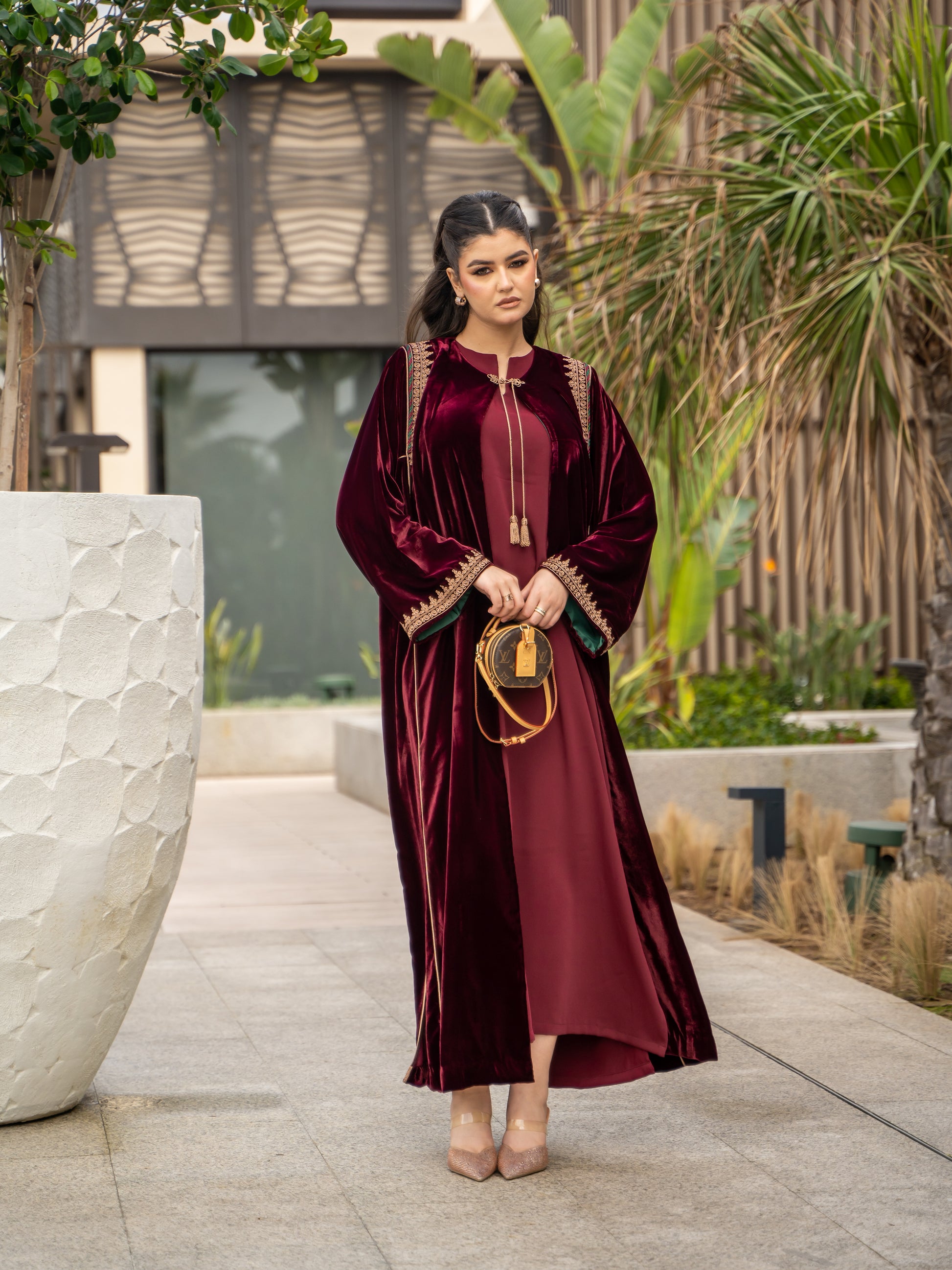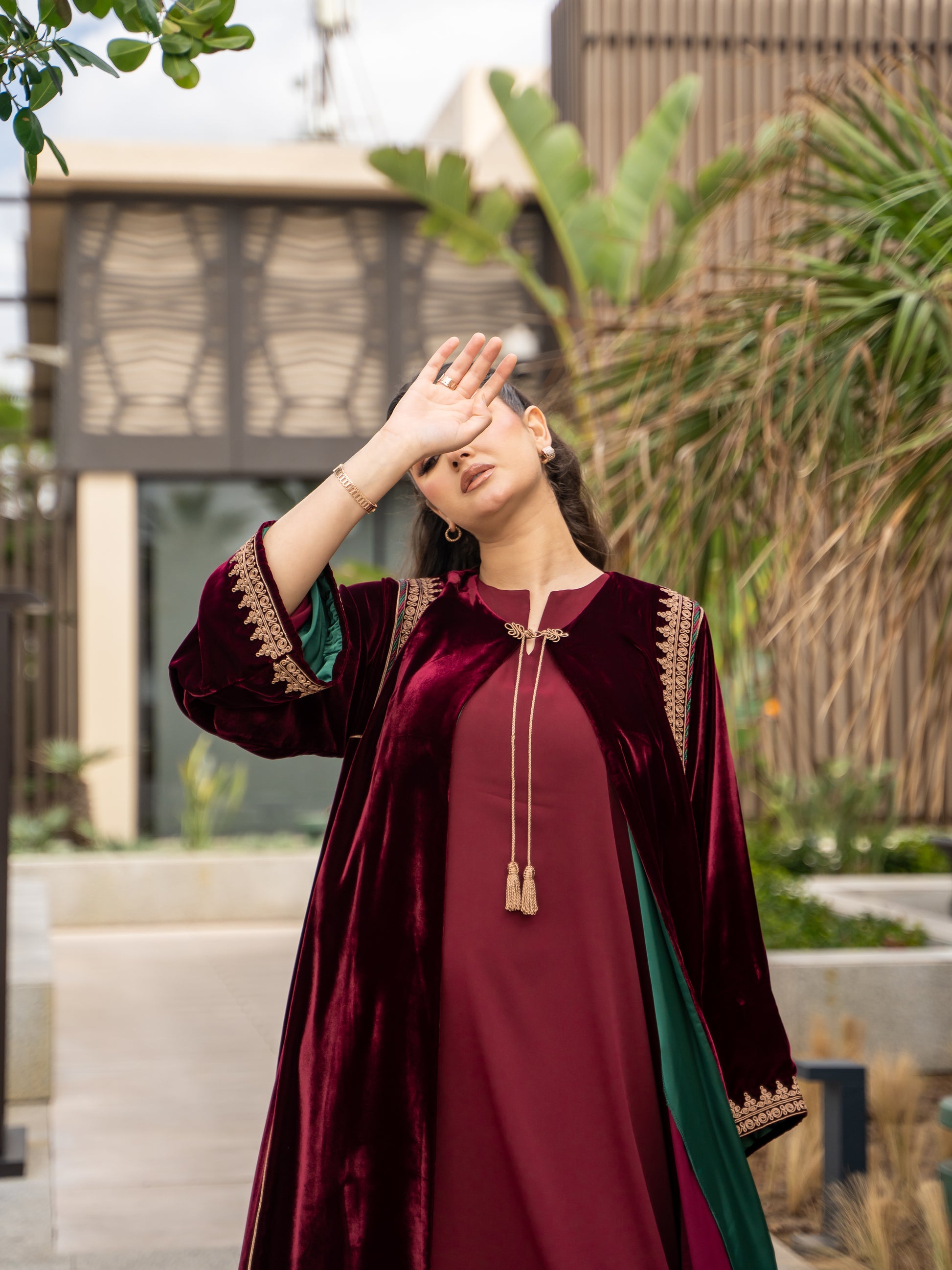 La pièce extérieure est confectionnée en velours de soie couleur bordeaux, aux reflets profonds et soyeux, délicatement rehaussée de satin de soie vert, symbole d’une alliance royale subtile et distinguée. Elle est sublimée par une broderie Zwaq Al Maâlem et une coupe traditionnelle marocaine (fssala makhzania), mettant en valeur la noblesse de la silhouette.