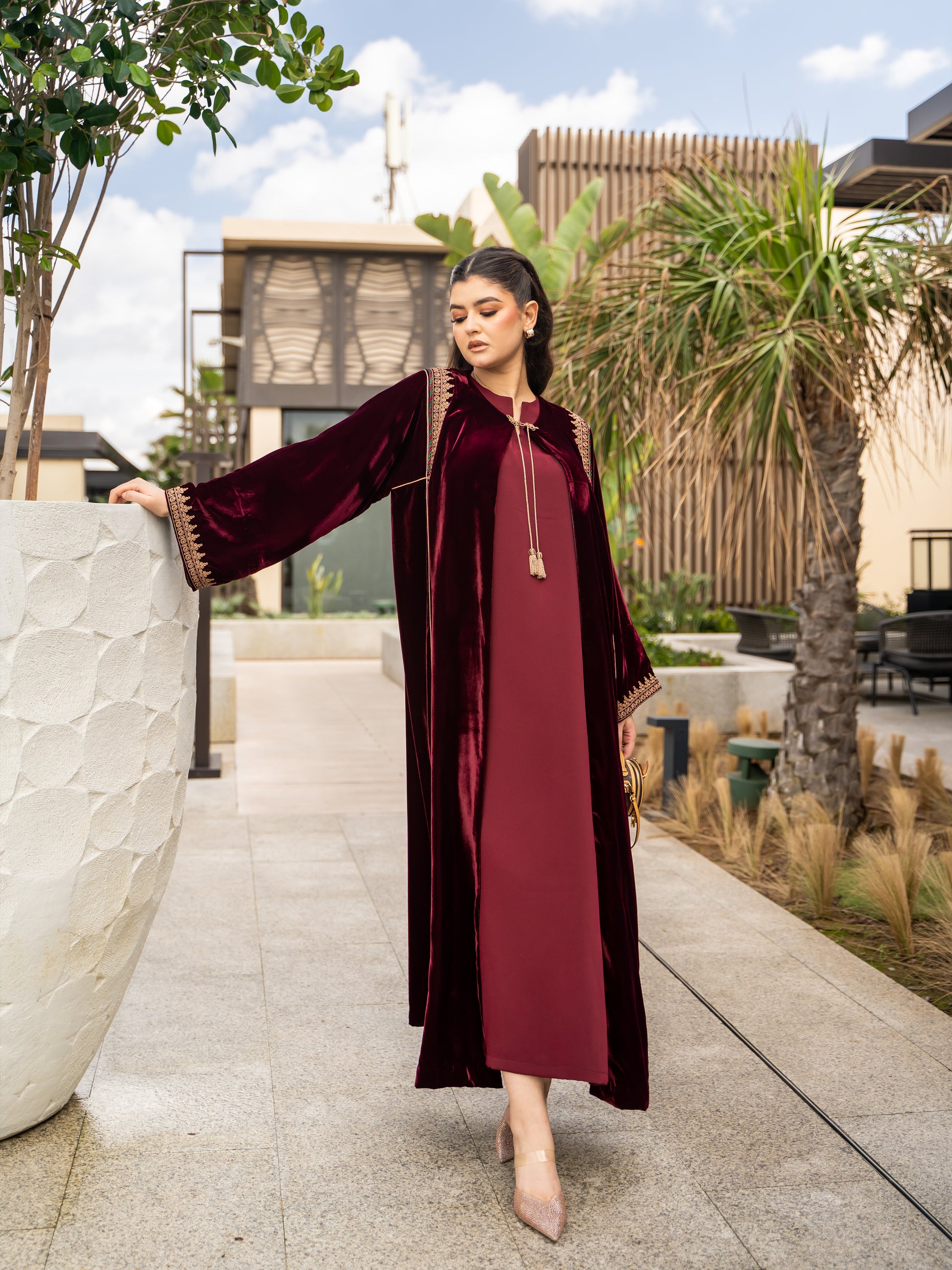 La sous-abaya, réalisée en crêpe de soie bordeaux, présente une coupe fluide et épurée, assurant confort et élégance naturelle.